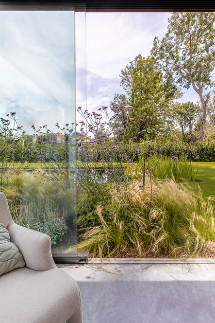 Deze tuin is duidelijk geslaagd in het opzet om in- en outdoor living in stijl optimaal te verzoenen. Binnen en buiten volledig versmolten dus. Dat idee zien we ook weerspiegeld achteraan in de tuin, waar het poolhouse een nauwe band onderhoudt met de zwemvijver.